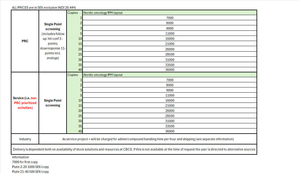 A: For PRC projects where CBCS is responsible for executing the screen the follow up is free of charge. Service projects will be charged for follow up requests (see price list), hence the lower initial price. In the end the cost will be the same for both. This change is done to make invoicing easier for compound center and facilitate flexibility for you and CBCS assay enablers.